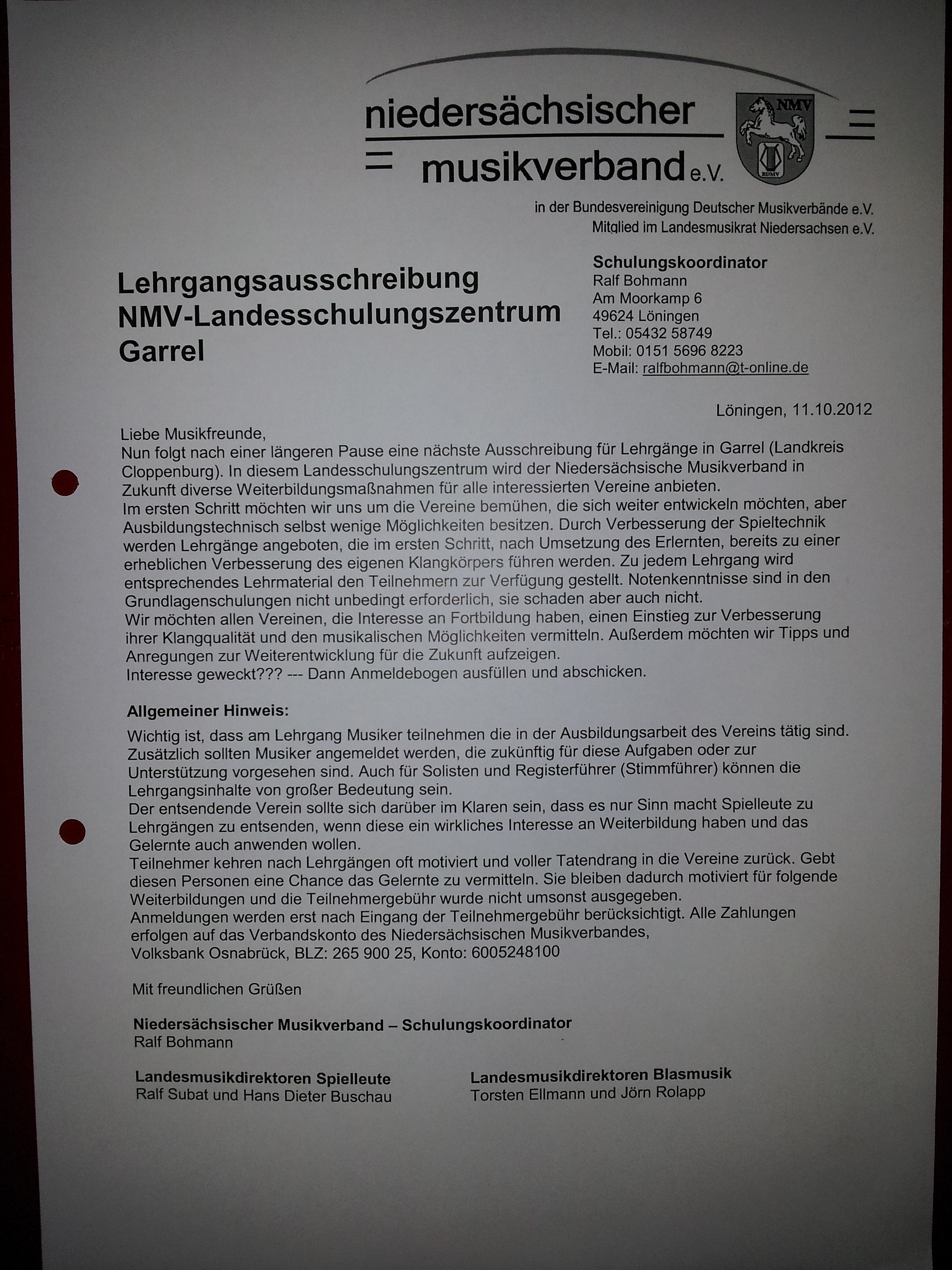 Am Samstag, den 24. November und Sonntag, den 25. November 2012 bietet der Niedersächsische Musikverband e.V. (NMV) wieder im Landesschulungszentrum Garrel umfangreiche Fortbildungsmaßnahmen an alle interessierten Vereine an.